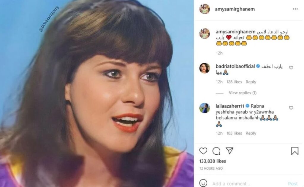 قامت إيمي سمير غانم بالدعاء لوالدتها: “يارب اشفي امي وعافيها”، حيث قام عدد من الفنانين بالدعاء لها في التعليقات.
