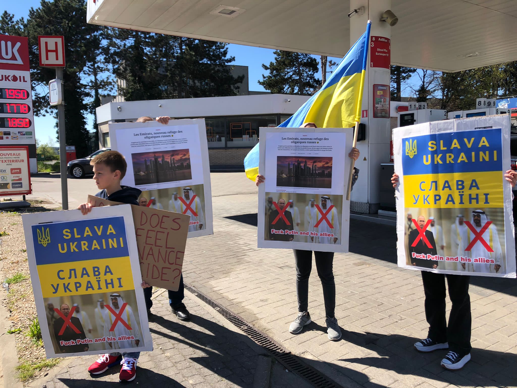 وكتب على لافتة (المجد لأوكرانيا واللعنة على بوتين وحلفائه)، وعلى أخرى عبارة (الإمارات توفر ملجأ للروس من العقوبات الأوربية).