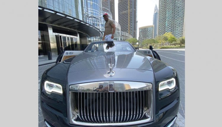 ويظهر المتهم أثناء رمي مبالغ مالية من سيارته في الإمارات متفاخرًا.
