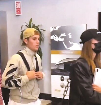 ويرتدي بيبر في المقطع لحظة وصوله ملابس رياضية، وزوجته ارتدت ملابس سوداء ووضعت كمامة خشية على صحتها.