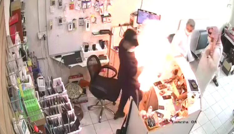 شاهد| انفجار مروع لبطارية بوجه صاحب محل هواتف في السعودية