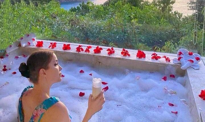 وأرفقت نسرين طافش تعليقًا: ”الاسترخاء في جاكوزي الفقاعات مع منظر مذهل .. كان من أفضل التجارب؟”.