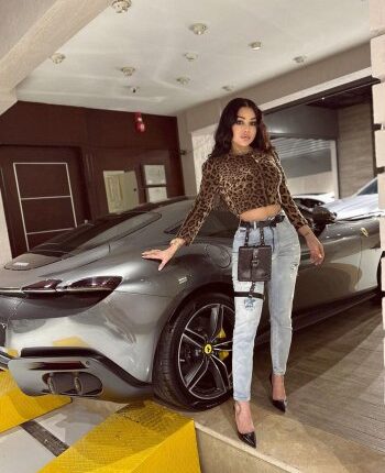 وبدت وهبي بأولى الصور بجوار سيارتها ترتدي تنورة قصيرة من الجلد الأسود.