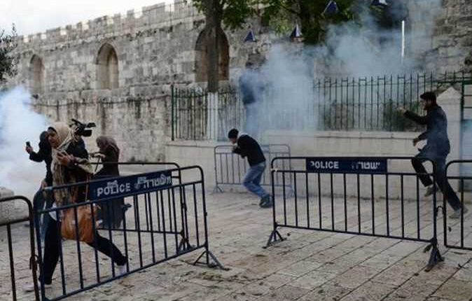 واعتلت قوات الشرطة الإسرائيلية سطح المصلى القبلي قبيل اقتحامه وحطمت أحد نوافذه وألقت عبرها قنابل الصوت على المعتكفين داخله، الذين رددوا هتافات “الله أكبر”.