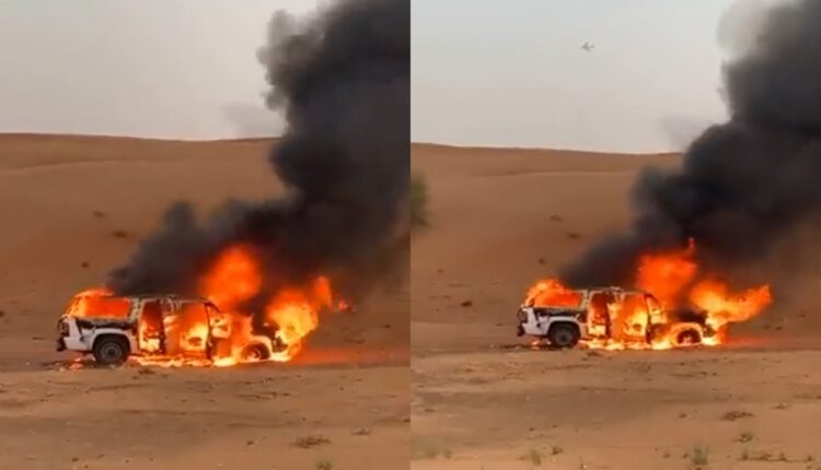 ويوثق المقطع احتراق السيارة في الصحراء، فيما يؤكد مالكها أنه قبلها بيوم سأله شخص كيف أن السيارة يستطيع الذهاب بها بأبو ظبي.