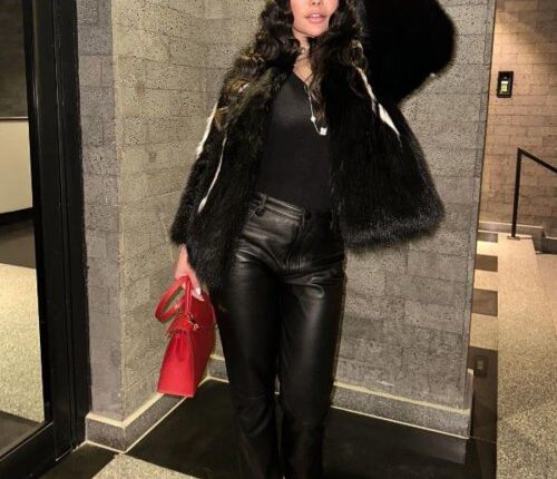 ووضعت وهبي جاكيت فرو مع حذاء أنيق بكعب عالٍ، وأمسكت بيدها حقيبة حمراء.