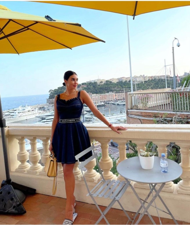 ياسمين صبري أطلت بفستان قصير من الدنيم القطني المطاطي باللون الأزرق من DOLCE & GABBANA .